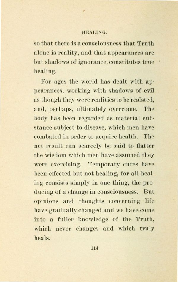 For ages the world has dealt with appearances, working with shadows of evil, as though they were realities to be resisted, and, perhaps, ultimately overcome. The body has been regarded as material substance subject to disease, which men have combated in order to acquire health. The net result can scarcely be said to flatter the wisdom which men have assumed they were exercising. Temporary cures have been effected but not healing, for all healing consists simply in one thing, the producing of a change in consciousness. But opinions and thoughts concerning life have gradually changed and we have come into a fuller knowledge of the Truth, which never changes and which truly heals.