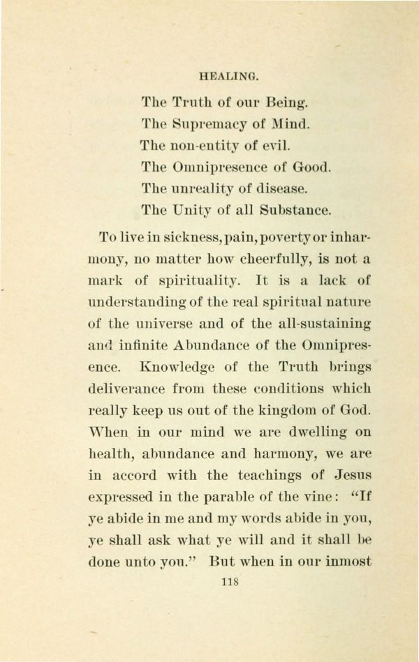 The Truth of our Being. The Supremacy of Mind. The non-entity of evil. The Omnipresence of Good. The unreality of disease. The Unity of all Substance.