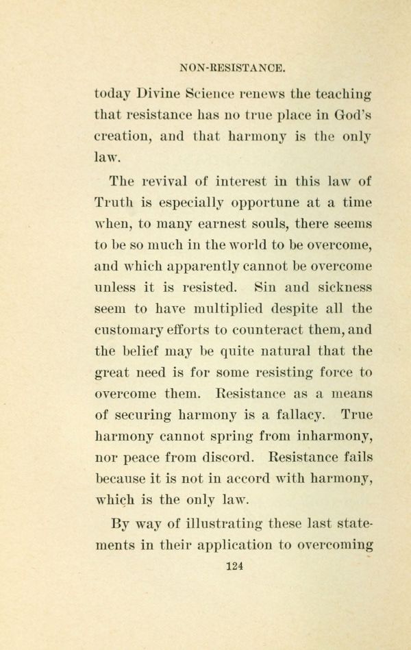 today Divine Science renews the teaching that resistance has no true place in God's creation, and that harmony is the only law.