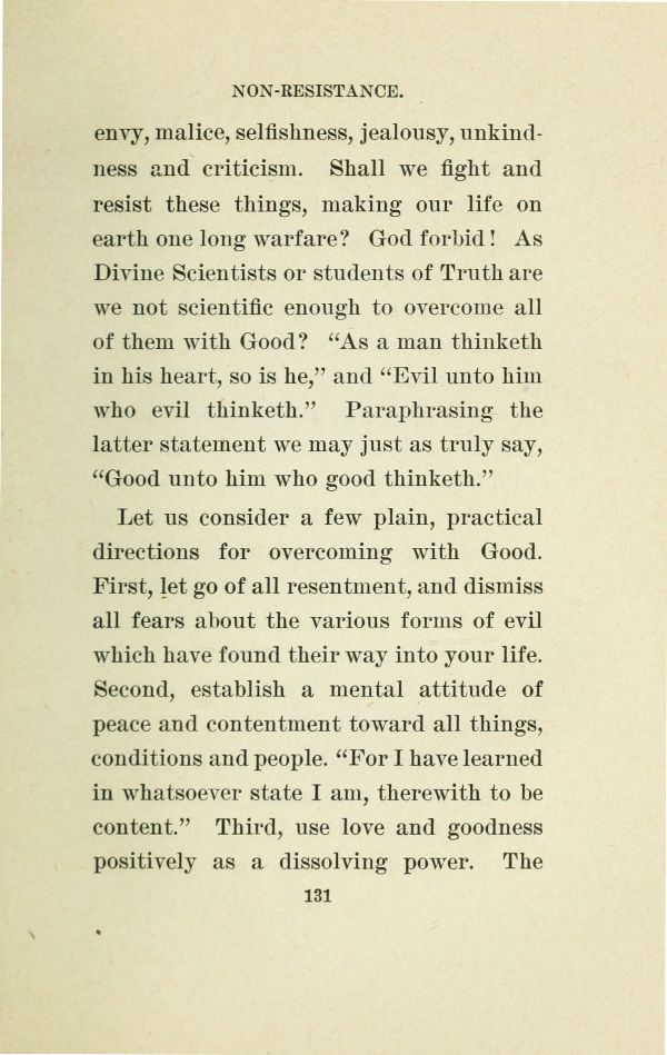 envy, malice, selfishness, jealousy, unkindness and criticism. Shall we fight and resist these things, making our life on earth one long warfare? God forbid! As Divine Scientists or students of Truth are we not scientific enough to overcome all of them with Good? "As a man thinketh in his heart, so is he," and "Evil unto him who evil thinketh." Paraphrasing the latter statement we may just as truly say, "Good unto him who good thinketh."