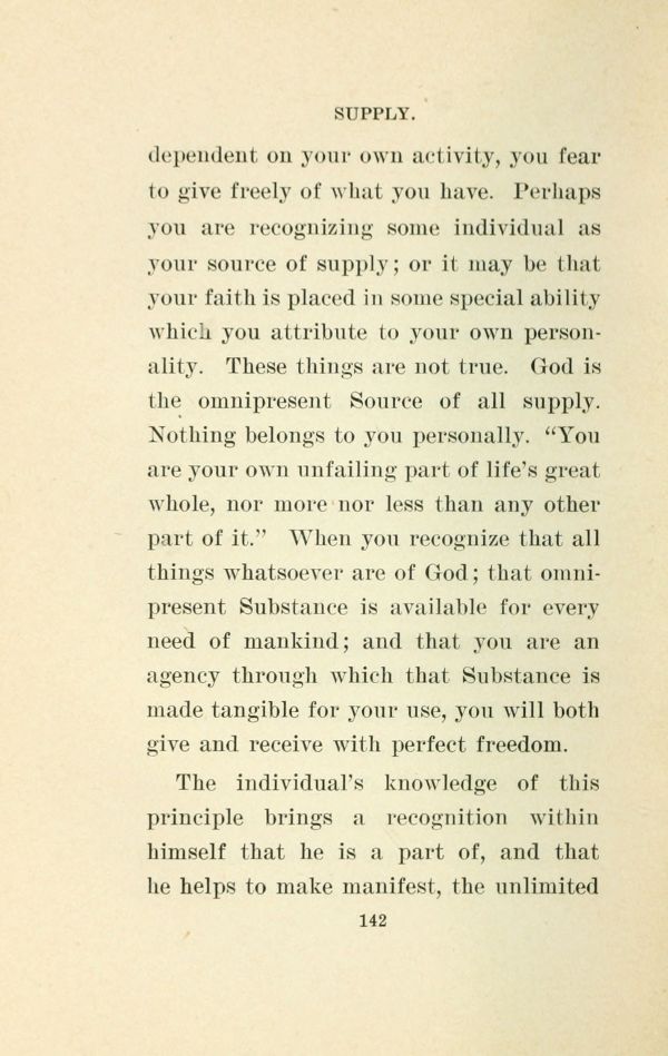 dependent on your own activity, you fear to give freely of what you have. Perhaps you are recognizing some individual as your source of supply; or it may be that your faith is placed in some special ability which you attribute to your own personality. These things are not true. God is the omnipresent Source of all supply. Nothing belongs to you personally. "You are your own unfailing part of life's great whole, nor more nor less than any other part of it." When you recognize that all things whatsoever are of God; that omnipresent Substance is available for every need of mankind; and that you are an agency through which that Substance is made tangible for your use, you will both give and receive with perfect freedom.