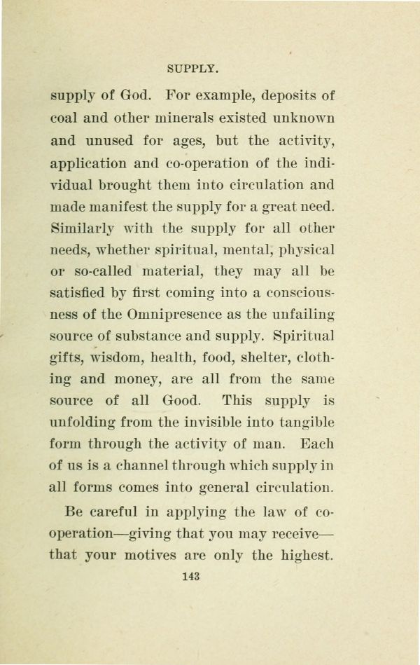supply of God. For example, deposits of coal and other minerals existed unknown and unused for ages, but the activity, application and co-operation of the individual brought them into circulation and made manifest the supply for a great need. Similarly with the supply for all other needs, whether spiritual, mental; physical or so-called material, they may all be satisfied by first coming into a consciousness of the Omnipresence as the unfailing source of substance and supply. Spiritual gifts, wisdom, health, food, shelter, clothing and money, are all from the same source of all Good. This supply is unfolding from the invisible into tangible form through the activity of man. Each of us is a channel through which supply in all forms comes into general circulation.