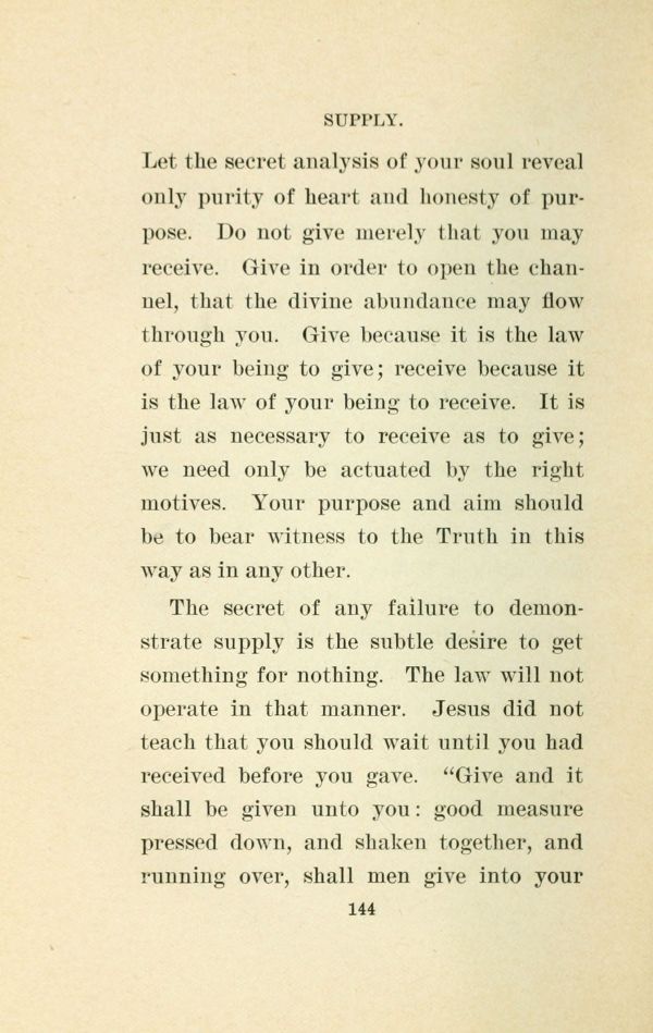 Let the secret analysis of your soul reveal only purity of heart and honesty of purpose. Do not give merely that you may receive. Give in order to open the channel, that the divine abundance may flow through you. Give because it is the law of your being to give; receive because it is the law of your being to receive. It is just as necessary to receive as to give; we need only be actuated by the right motives. Your purpose and aim should be to bear witness to the Truth in this way as in any other.