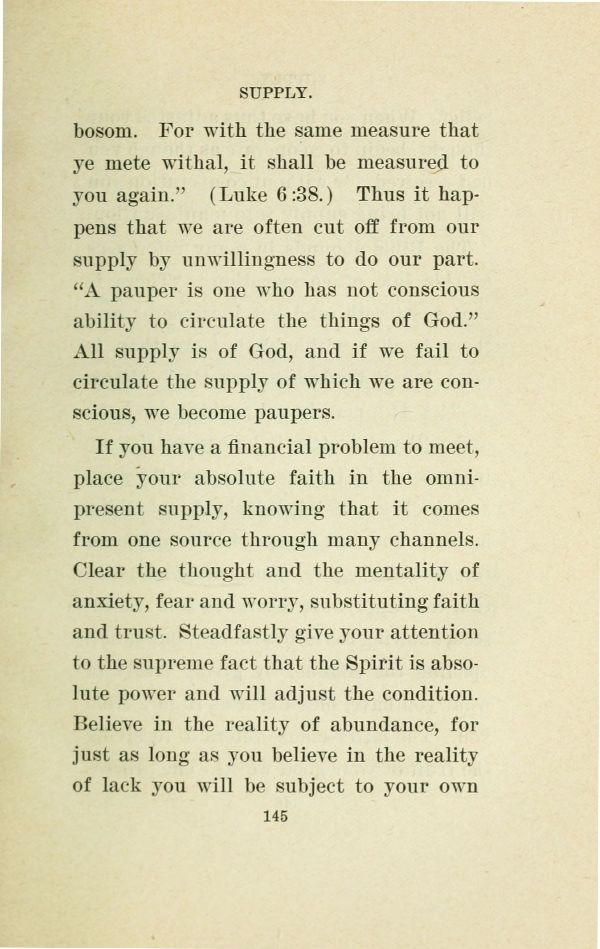 bosom. For with the same measure that ye mete withal, it shall be measures] to you again." ( Luke 6:38.) Thus it happens that we are often cut off from our supply by unwillingness to do our part. "A pauper is one who has not conscious ability to circulate the things of God." All supply is of God, and if we fail to circulate the supply of which we are conscious, we become paupers.