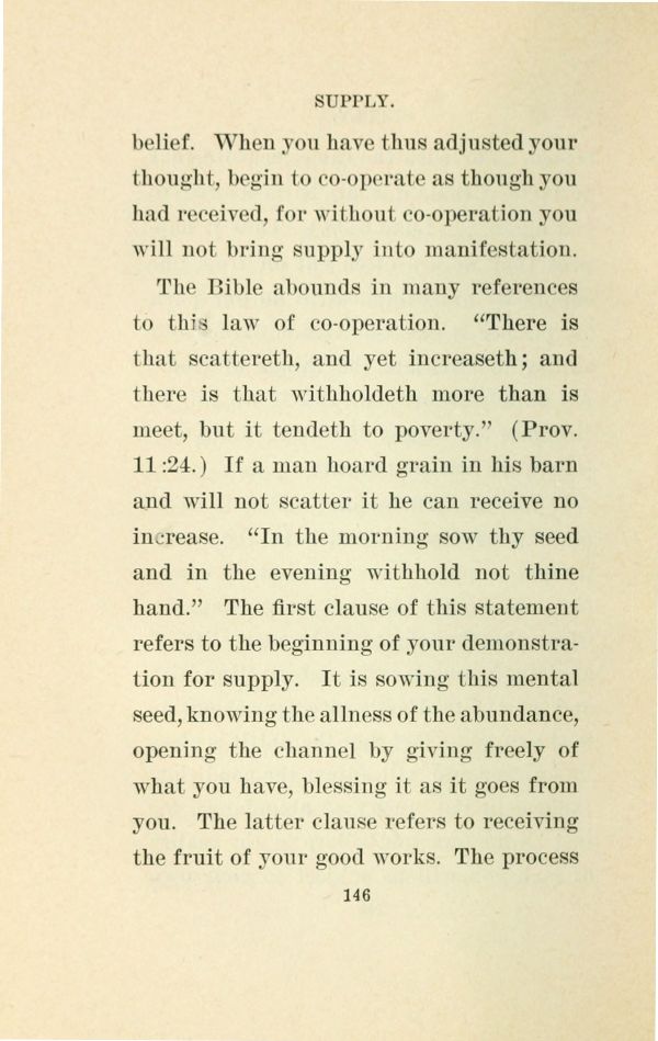 belief. When you have thus adjusted your thought, begin to cooperate as though you had received, for without cooperation you will not bring supply into manifestation.