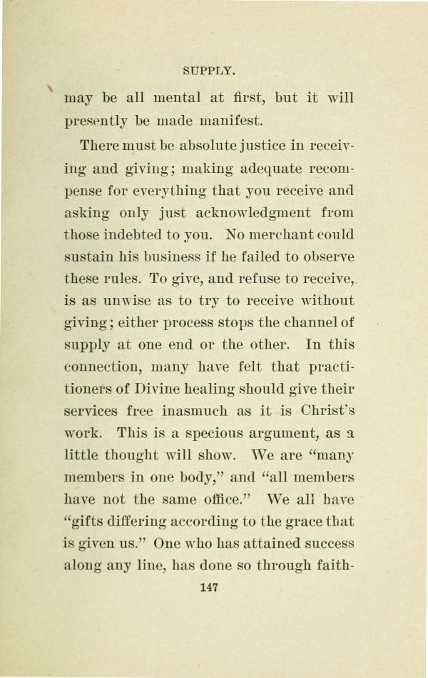 There must be absolute justice in receiving and giving; making adequate recompense for everything that you receive and asking only just acknowledgment from those indebted to you. No merchant could sustain his business if he failed to observe these rules. To give, and refuse to receive, is as unwise as to try to receive without giving; either process stops the channel of supply at one end or the other. In this connection, many have felt that practitioners of Divine healing should give their services free inasmuch as it is Christ's work. This is a specious argument, as a little thought will show. We are "many members in one body," and "all members have not the same office." We all have "gifts differing according to the grace that is given us." One who has attained success along any line, has done so through faithful