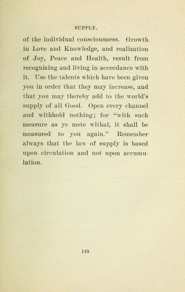 application and at the expense of time and means. No one would expect gratuitous service from such a person or think of withholding reasonable compensation. Jesus told his disciples, when sending them out to do his work, that "the laborer is worthy of his hire." Mere empty pride actuates that person who wishes always to give, without receiving any compensation therefor; and by compensation we do not necessarily mean money, for there are many other ways of rendering adequate return. You are depriving anyone of his very means of demonstrating supply if you positively decline to allow him to give something in return for what he has received. Such a process makes paupers instead of individuals who recognize the true source of all things.