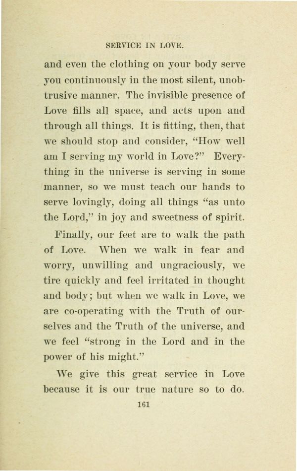 and even the clothing on your body serve you continuously in the most silent, unobtrusive manner. The invisible presence of Love fills all space, and acts upon and through all things. It is fitting, then, that we should stop and consider, "How well am I serving my world in Love?" Everything in the universe is serving in some manner, so we must teach our hands to serve lovingly, doing all things "as unto the Lord," in joy and sweetness of spirit.