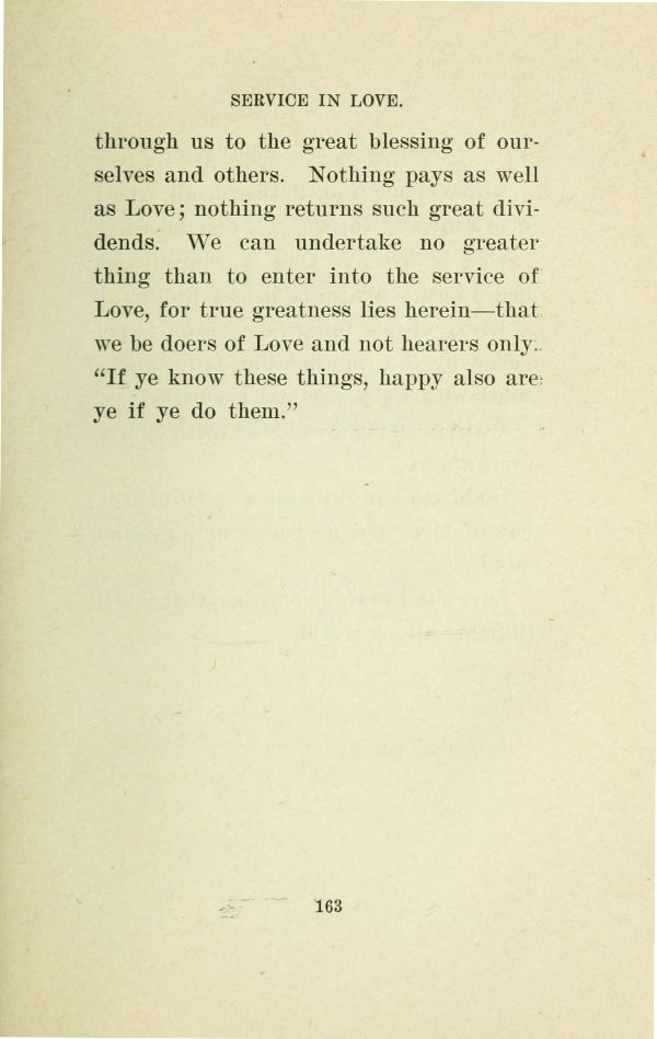 through us to the great blessing of ourselves and others. Nothing pays as well as Love; nothing returns such great dividends. We can undertake no greater thing than to enter into the service of Love, for true greatness lies herein --- that we be doers of Love and not hearers only. "If ye know these things, happy also are ye if ye do them."