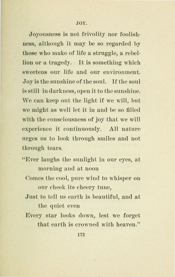 Joyousness is not frivolity nor foolishness, although it may be so regarded by those who make of life a struggle, a rebellion or a tragedy. It is something which sweetens our life and our environment. Joy is the sunshine of the soul. If the soul is still in darkness, open it to the sunshine. We can keep out the light if we will, but we might as well let it in and be so filled with the consciousness of joy that we will experience it continuously. All nature urges us to look through smiles and not through tears.