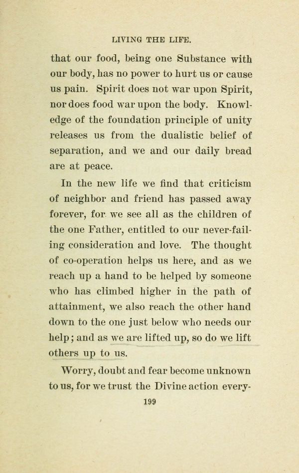 In the new life we find that criticism of neighbor and friend has passed away forever, for we see all as the children of the one Father, entitled to our never-failing consideration and love. The thought of cooperation helps us here, and as we reach up a hand to be helped by someone who has climbed higher in the path of attainment, we also reach the other hand down to the one just below who needs our help; and as we are lifted up, so do we lift others up to us.