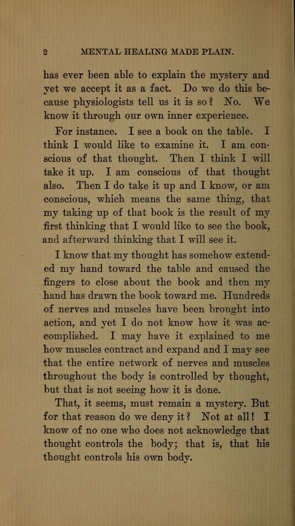 That, it seems, must remain a mystery. But for that reason do we deny it? Not at all! I know of no one who does not acknowledge that thought controls the body; that is, that his thought controls his own body.