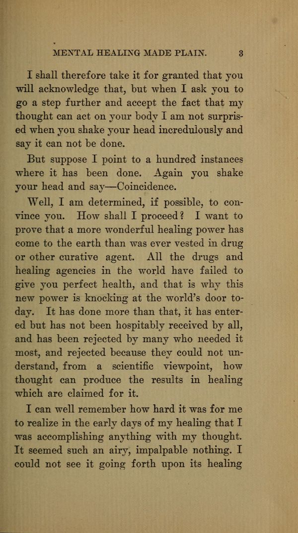 I shall therefore take it for granted that you will acknowledge that, but when I ask you to go a step further and accept the fact that my thought can act on your body I am not surprised when you shake your head incredulously and say it can not be done.