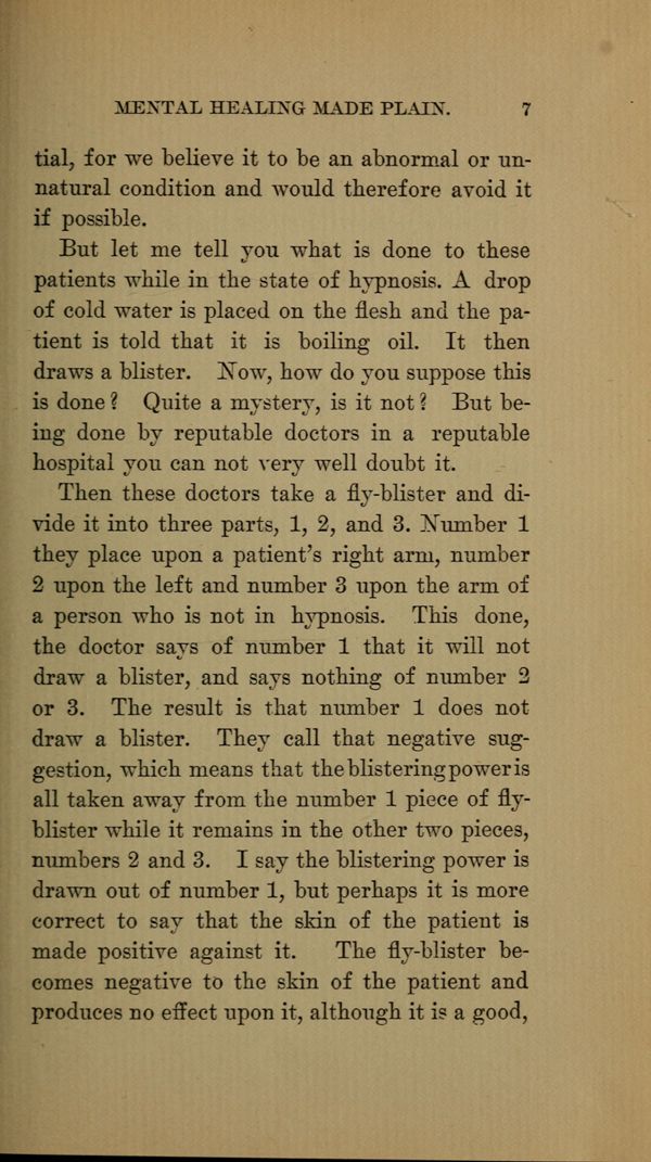 This done,the doctor says of number 1 that it will not draw a blister, and says nothing of number 2 or 3. The result is that number 1 does not draw a blister. They call that negative suggestion, which means that the blistering power is all taken away from the number 1 piece of flyblister while it remains in the other two pieces, numbers 2 and 3. I say the blistering power is drawn out of number 1, but perhaps it is more correct to say that the skin of the patient is made positive against it. The fly-blister becomes negative to the skin of the patient and produces no effect upon it, although it is a good,