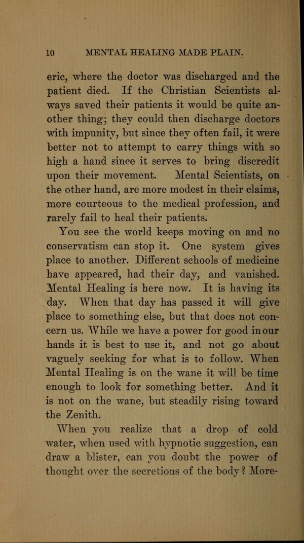 where the doctor was discharged and the patient died. If the Christian Scientists always saved. their patients it would be quite another thing; they could then discharge doctors with impunity, hut since they often fail, it were better not to attempt to carry things with so high a hand since it serves to bring discredit upon their movement. Mental Scientists, on the other hand, are more modest in their claims, more courteous to the medical profession, and rarely fail to heal their patients.