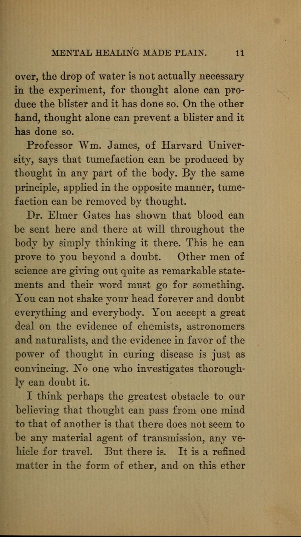 Professor Wm. James, of Harvard University, says that tumefaction can be produced by thought in any part of the body. By the same principle, applied in the opposite manner, tumefaction can be removed by thought.