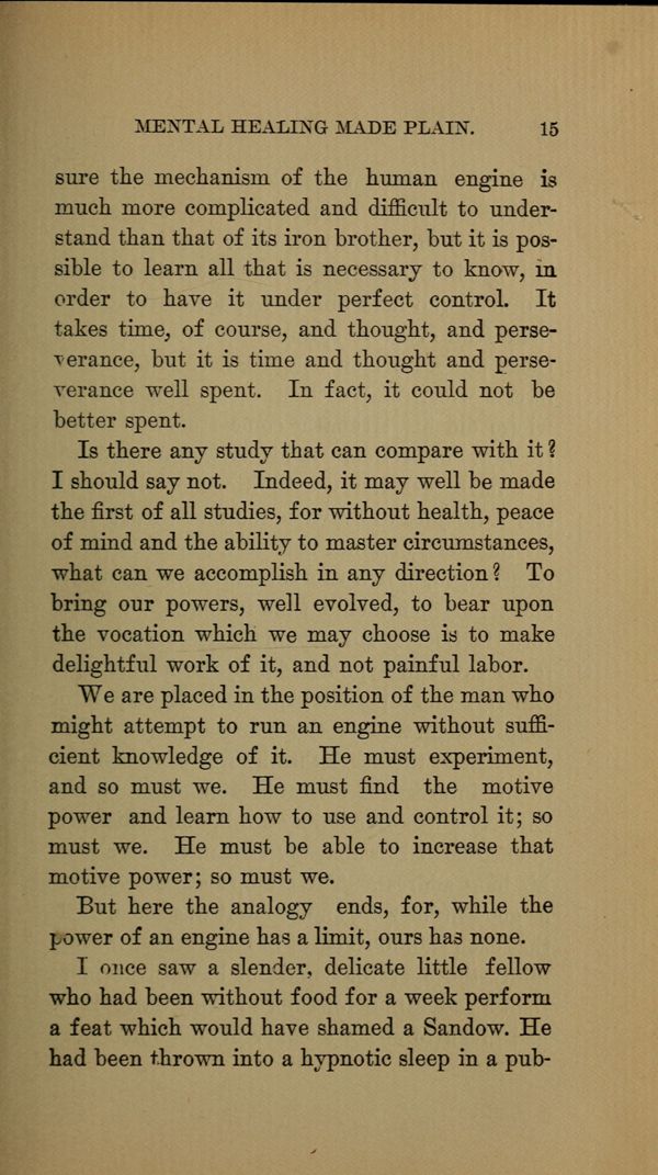 sure the mechanism of the human engine is much more complicated and difficult to understand than that of its iron brother, but it is possible to learn all that is necessary to know, in order to have it under perfect control. It takes time, of course, and thought, and perseverance, but it is time and thought and perseverance well spent. In fact, it could not be better spent.