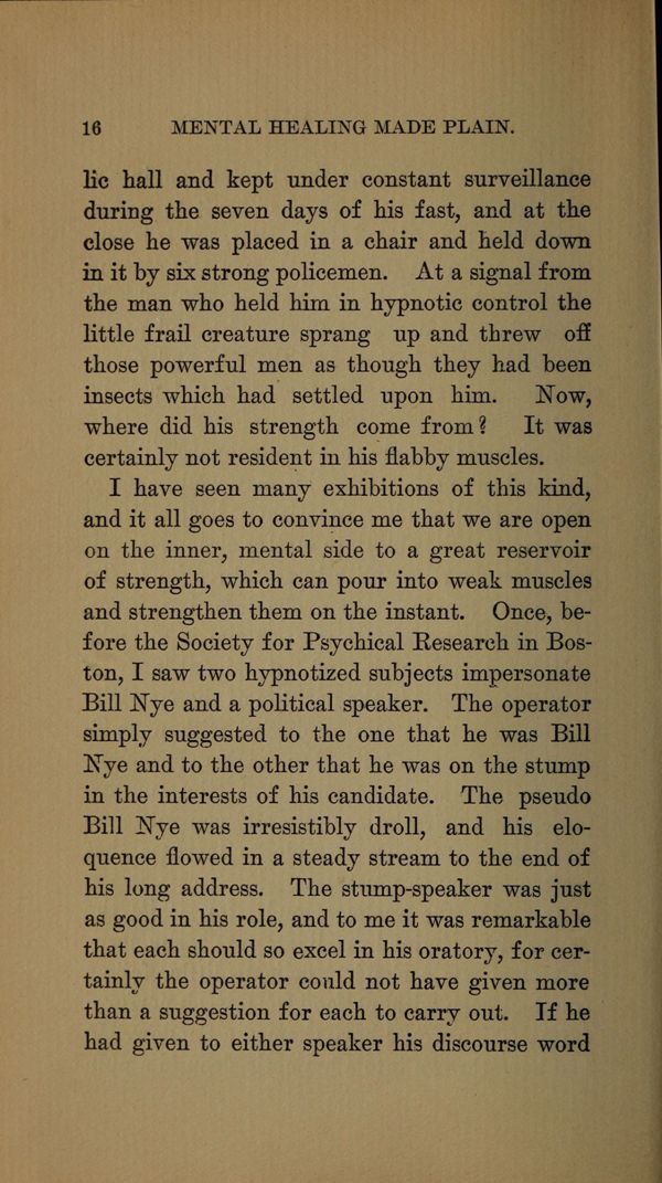I have seen many exhibitions of this kind, and it all goes to convince me that we are open on the inner, mental side to a great reservoir of strength, which can pour into weak muscles and strengthen them on the instant. Once, before the Society for Psychical Research in Boston, I saw two hypnotized subjects impersonate Bill Nye and a political speaker. The operator simply suggested to the one that he was Bill Nye and to the other that he was on the stump in the interests of his candidate. The pseudo Bill Nye was irresistibly droll, and his eloquence flowed in a steady stream to the end of his long address. The stump-speaker was just as good in his role, and to me it was remarkable that each should so excel in his oratory, for certainly the operator could not have given more than a suggestion for each to carry out. If he had given to either speaker his discourse word