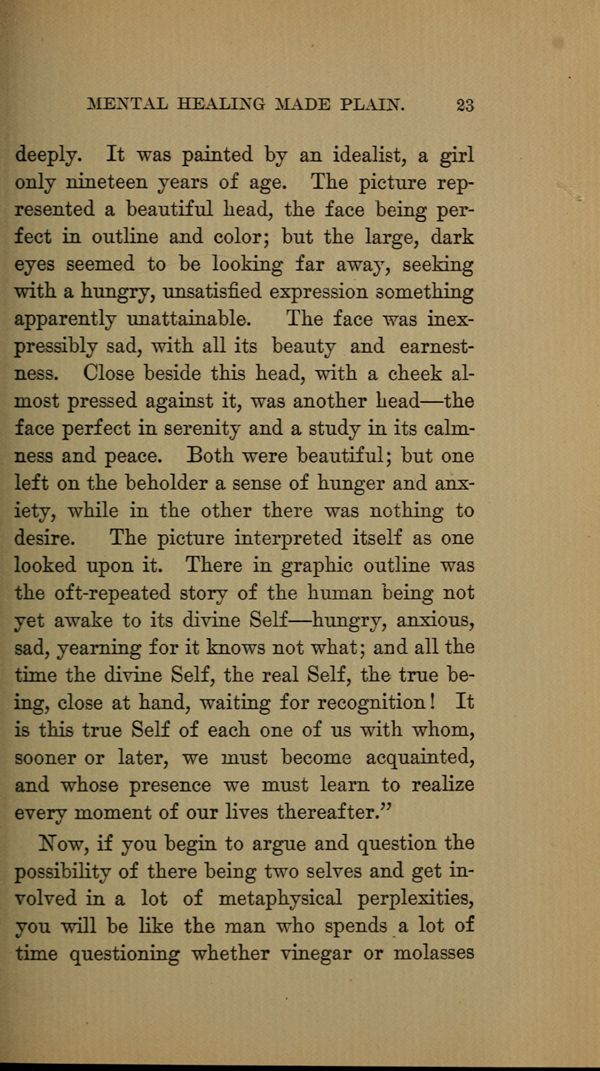 Close beside this head, with a cheek almost pressed against it, was another head the face perfect in serenity and a study in its calmness and peace. Both were beautiful; but one left on the beholder a sense of hunger and anxiety, while in the other there was nothing to desire. The picture interpreted itself as one looked upon it. There in graphic outline was the oft-repeated story of the human being not yet awake to its divine Self -- hungry, anxious, sad, yearning for it knows not what; and all the time the divine Self, the real Self, the true being, close at hand, waiting for recognition! It is this true Self of each one of us with whom, sooner or later, we must become acquainted, and whose presence we must learn to realize every moment of our lives thereafter."