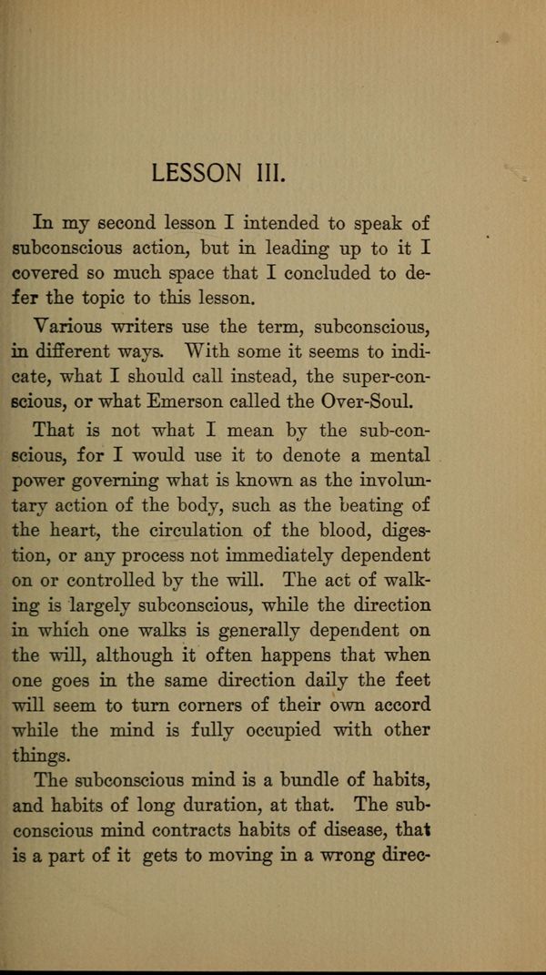 In my second lesson I intended to speak of subconscious action, but in leading up to it I covered so much space that I concluded to defer the topic to this lesson.