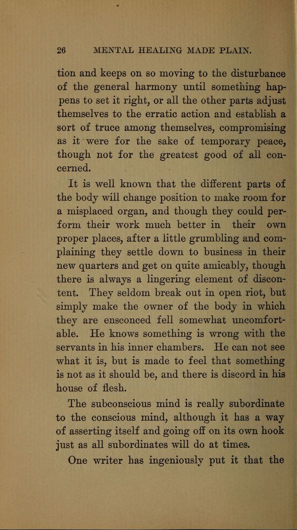 and keeps on so moving to the disturbance of the general harmony until something happens to set it right, or all the other parts adjust themselves to the erratic action and establish a sort of truce among themselves, compromising as it were for the sake of temporary peace, though not for the greatest good of all concerned. It is well known that the different parts of the body will change position to make room for a misplaced organ, and though they could perform their work much better in their own proper places, after a little grumbling and complaining they settle down to business in their new quarters and get on quite amicably, though there is always a lingering element of discontent.