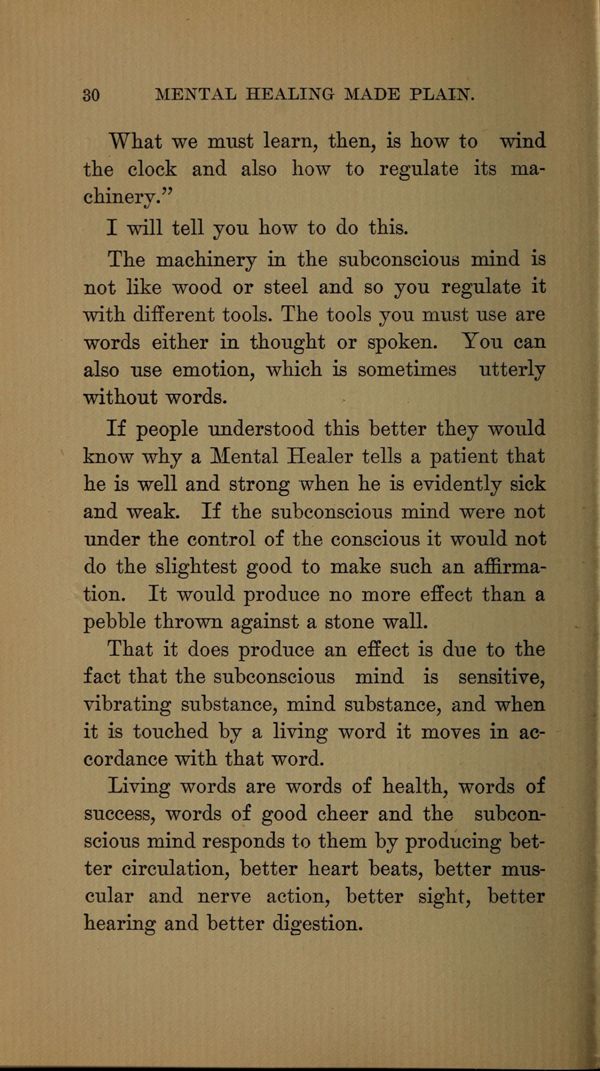 The machinery in the subconscious mind is not like wood or steel and so you regulate it with different tools. The tools you must use are words either in thought or spoken. You can also use emotion, which is sometimes utterly without words.