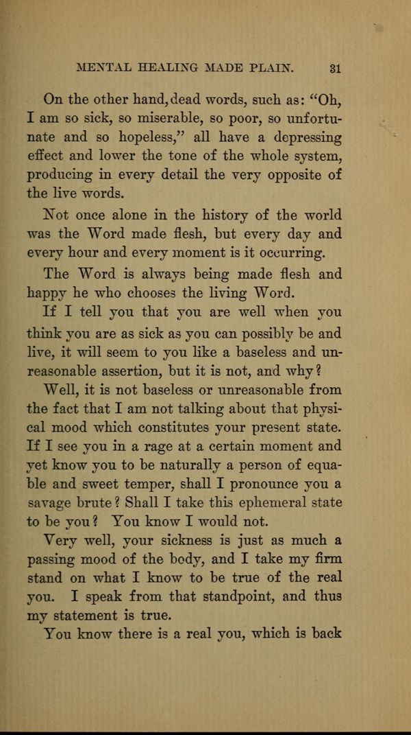On the other hand, dead words, such as: "Oh, I am so sick, so miserable, so poor, so unfortunate and so hopeless," all have a depressing effect and lower the tone of the whole system, producing in every detail the very opposite of the live words.