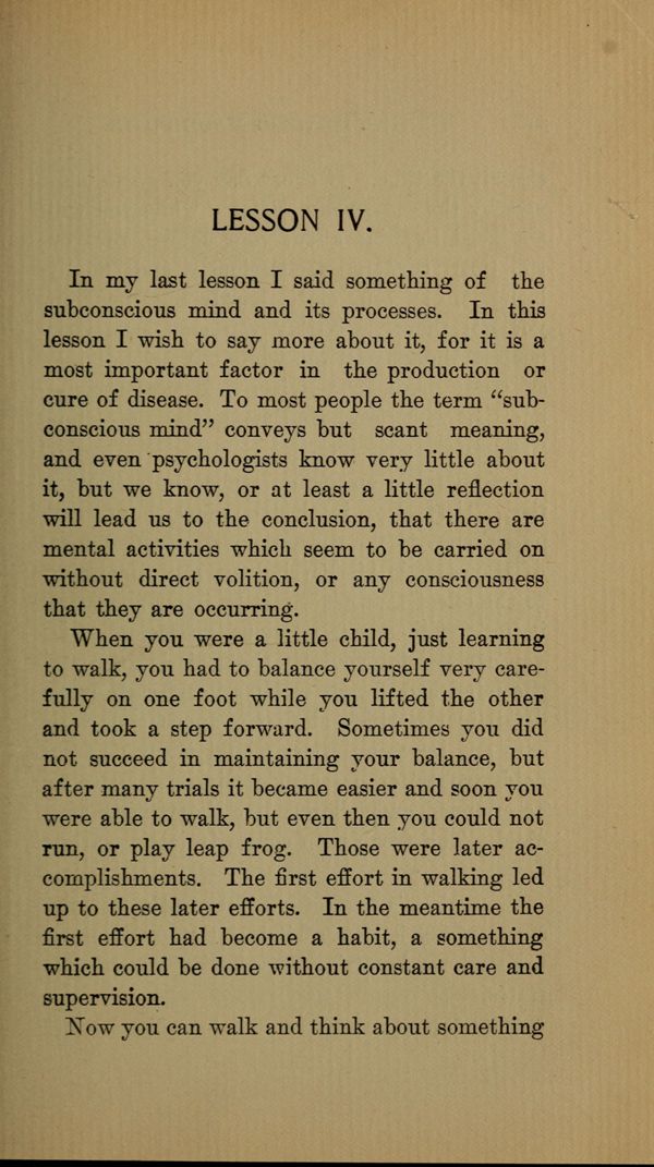 In my last lesson I said something of the subconscious mind and its processes. In this lesson I wish to say more about it, for it is a most important factor in the production or cure of disease. To most people the term "subconscious mind" conveys but scant meaning, and even -psychologists know very little about it, but we know, or at least a little reflection will lead us to the conclusion, that there are mental activities which seem to be carried on without direct volition, or any consciousness that they are occurring.