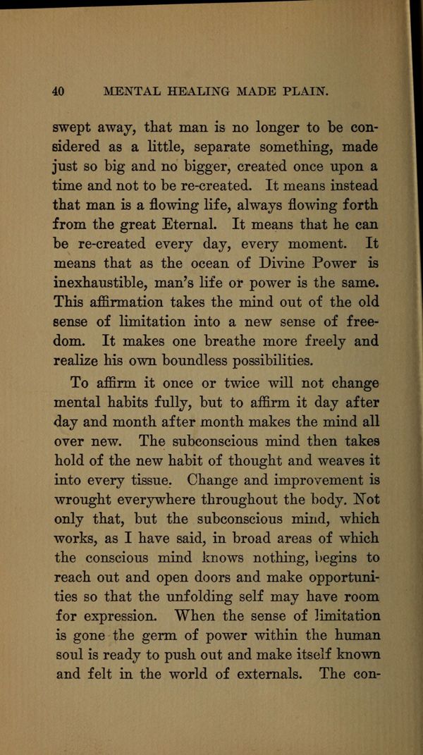 To affirm it once or twice will not change mental habits fully, but to affirm it day after day and month after month makes the mind all over new. The subconscious mind then takes hold of the new habit of thought and weaves it into every tissue. Change and improvement is wrought everywhere throughout the body. Not only that, but the subconscious mind, which works, as I have said, in broad areas of which the conscious mind knows nothing, begins to reach out and open doors and make opportunities so that the unfolding self may have room for expression. When the sense of limitation is gone the germ of power within the human soul is ready to push out and make itself known and felt in the world of externals. The conscious