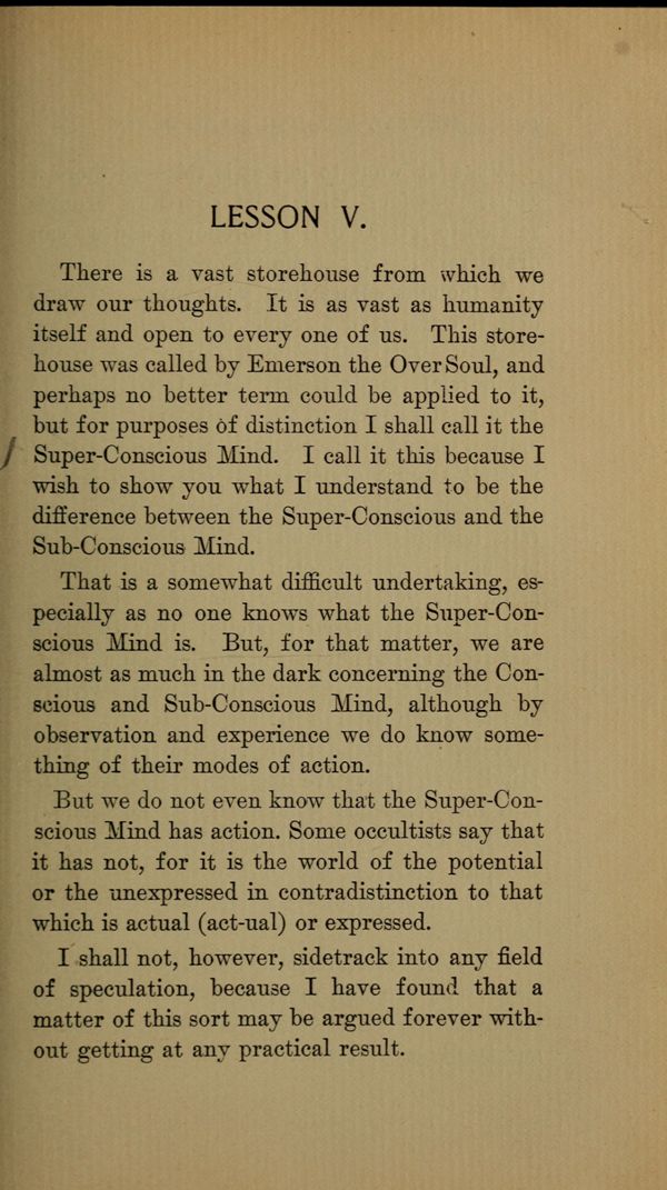 There is a vast storehouse from which we draw our thoughts. It is as vast as humanity itself and open to every one of us. This storehouse was called by Emerson the Over Soul, and perhaps no better term could be applied to it, but for purposes of distinction I shall call it the Super-Conscious Mind. I call it this because I wish to show you what I understand to be the difference between the Super-Conscious and the Sub-Conscious Mind.