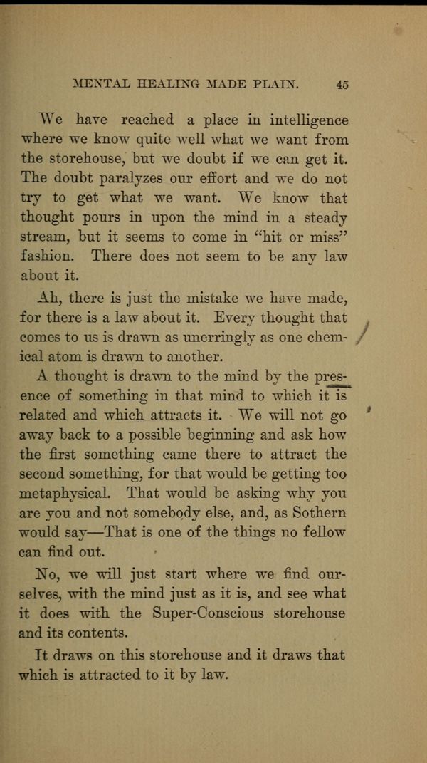 A thought is drawn to the mind by the presence of something in that mind to which it is related and which attracts it. We will not go away back to a possible beginning and ask how the first something came there to attract the second something, for that would be getting too metaphysical. That would be asking why you are you and not somebody else, and, as Sothern would say That is one of the things no fellow can find out.