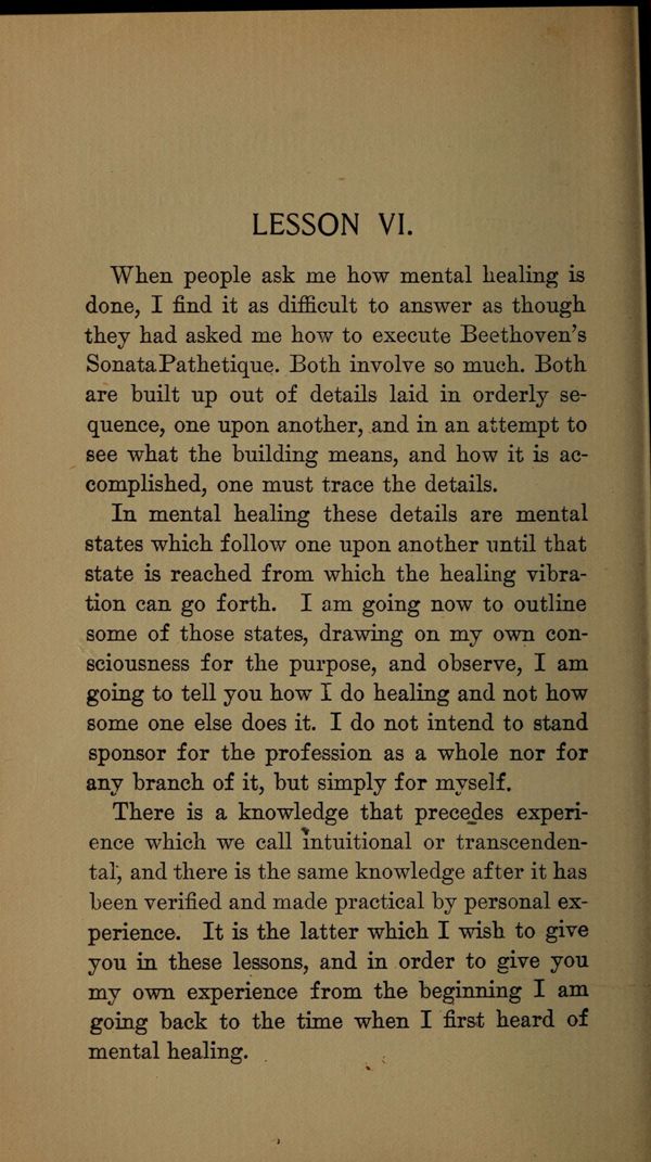 It is the latter which I wish to give you in these lessons, and in order to give you my own experience from the beginning I am going back to the time when I first heard of mental healing.