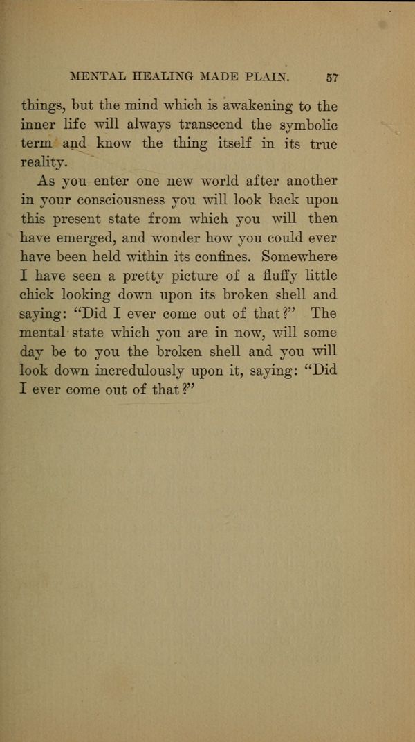 As you enter one new world after another in your consciousness you will look back upon this present state from which you will then have emerged, and wonder how you could ever have been held within its confines. Somewhere I have seen a pretty picture of a fluffy little chick looking down upon its broken shell and saying: "Did I ever come out of that?" The mental state which you are in now, will some day be to you the broken shell and you will look down incredulously upon it, saying: "Did I ever come out of that?"
