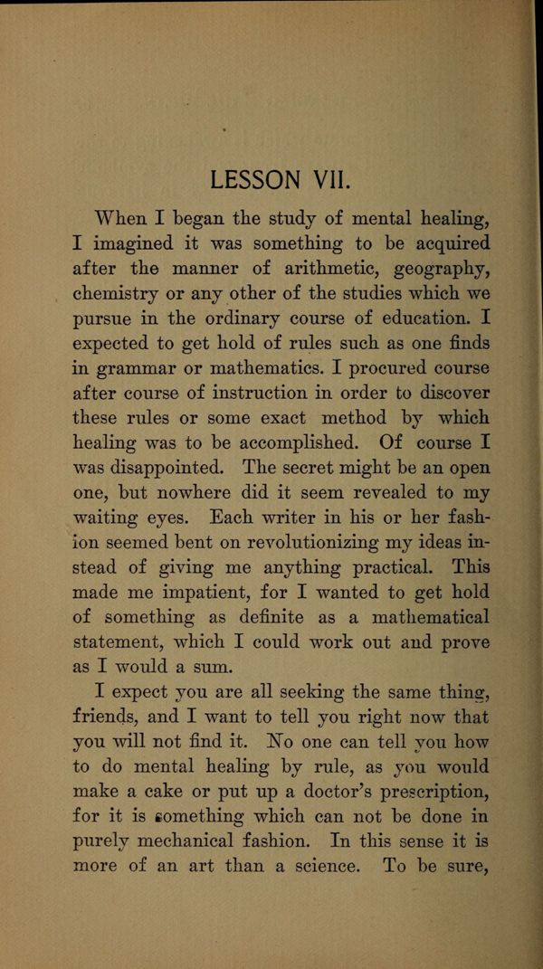 When I began the study of mental healing, I imagined it was something to be acquired after the manner of arithmetic, geography, chemistry or any other of the studies which we pursue in the ordinary course of education. I expected to get hold of rules such as one finds in grammar or mathematics. I procured course after course of instruction in order to discover these rules or some exact method by which healing was to be accomplished. Of course I was disappointed. The secret might be an open one, but nowhere did it seem revealed to my waiting eyes. Each writer in his or her fashion seemed bent on revolutionizing my ideas instead of giving me anything practical. This made me impatient, for I wanted to get hold of something as definite as a mathematical statement, which I could work out and prove as I would a sum.