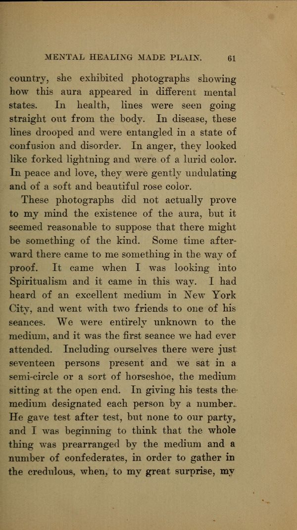 These photographs did not actually prove to my mind the existence of the aura, but it seemed reasonable to suppose that there might be something of the kind. Some time afterward there came to me something in the way of proof. It came when I was looking into Spiritualism and it came in this way. I had heard of an excellent medium in New York City, and went with two friends to one of his seances. We were entirely unknown to the medium, and it was the first seance we had ever attended. Including ourselves there were just seventeen persons present and we sat in a semi-circle or a sort of horseshoe, the medium sitting at the open end. In giving his tests the medium designated each person by a number.
