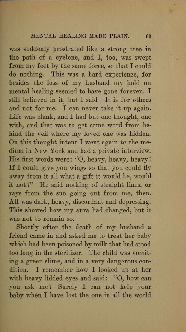 Life was blank, and I had but one thought, one wish, and that was to get some word from behind the veil where my loved one was hidden. On this thought intent I went again to the medium in New York and had a private interview. His first words were: "0, heavy, heavy, heavy! If I could give you wings so that you could fly away from it all what a gift it would be, would it not?" He said nothing of straight lines, or rays from the sun going out from me, then.