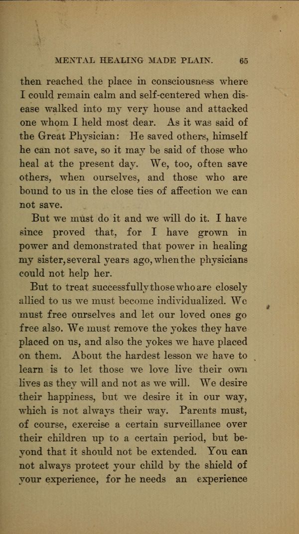But to treat successfully those who are closely allied to us we must become individualized. We must free ourselves and let our loved ones go free also. We must remove the yokes they have placed on us, and also the yokes we have placed on them. About the hardest lesson we have to learn is to let those we love live their own lives as they will and not as we will. We desire their happiness, but we desire it in our way, which is not always their way. Parents must, of course, exercise a certain surveillance over their children up to a certain period, but beyond that it should not be extended. You can not always protect your child by the shield of your experience, for he needs an experience