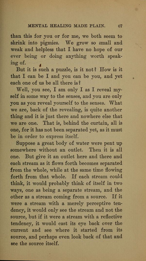 Suppose a great body of water were pent up somewhere without an outlet. Then it is all one. But give it an outlet here and there and each stream as it flows forth becomes separated from the whole, while at the same time flowing forth from that whole. If each stream could think, it would probably think of itself in two ways, one as being a separate stream, and the other as a stream coming from a source. If it were a stream with a merely perceptive tendency, it would only see the stream and not the source, but if it were a stream with a reflective tendency, it would cast its eye back over the current and see where it started from its source, and perhaps even look back of that and see the source itself.