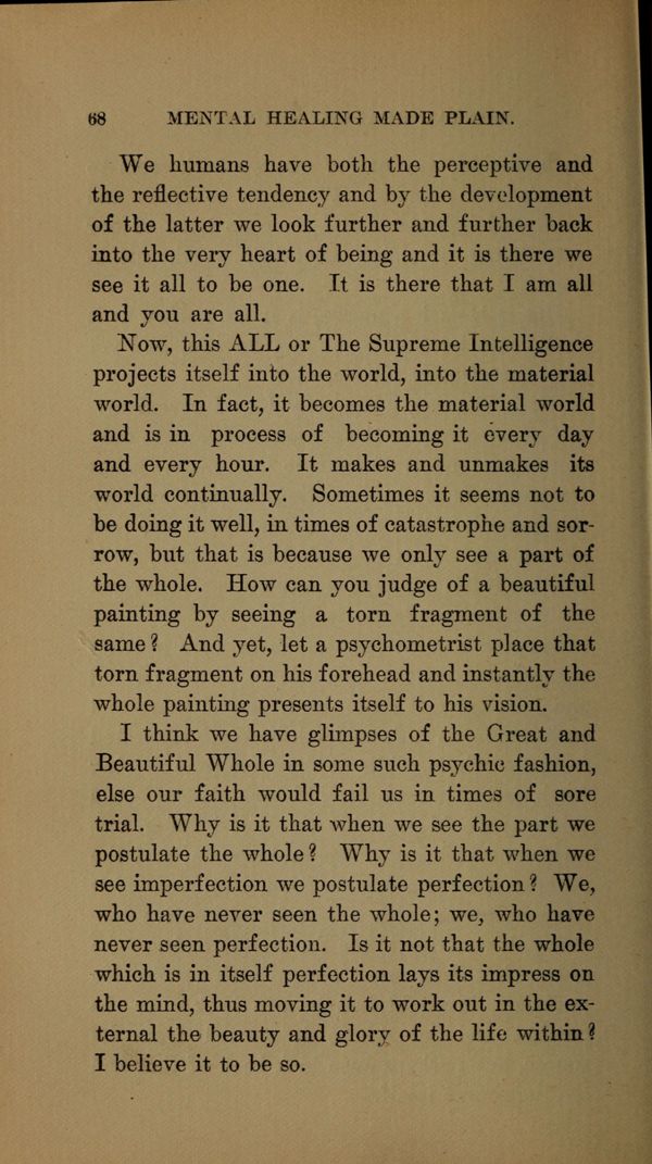 Now, this ALL or The Supreme Intelligence projects itself into the world, into the material world. In fact, it becomes the material world and is in process of becoming it every day and every hour. It makes and unmakes its world continually. Sometimes it seems not to be doing it well, in times of catastrophe and sorrow, but that is because we only see a part of the whole. How can you judge of a beautiful painting by seeing a torn fragment of the same? And yet, let a psychometrist place that torn fragment on his forehead and instantly the whole painting presents itself to his vision.
