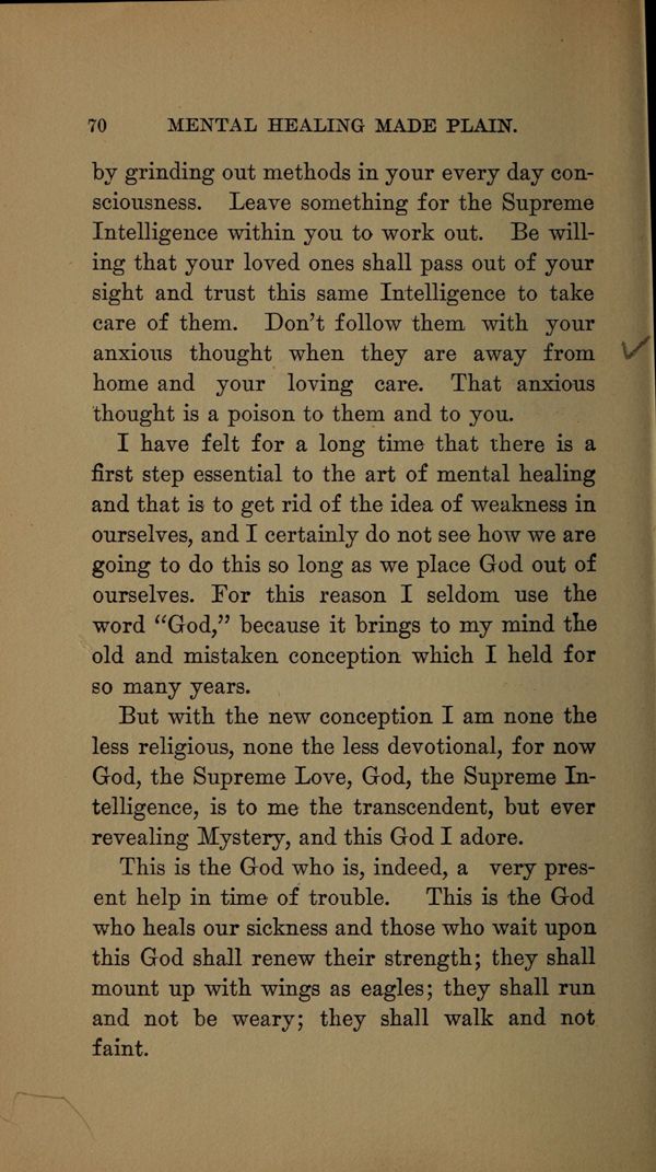 I have felt for a long time that there is a first step essential to the art of mental healing and that is to get rid of the idea of weakness in ourselves, and I certainly do not see, how we are going to do this so long as we place God out of ourselves. For this reason I seldom use the word "God," because it brings to my mind the old and mistaken conception which I held for so many years.