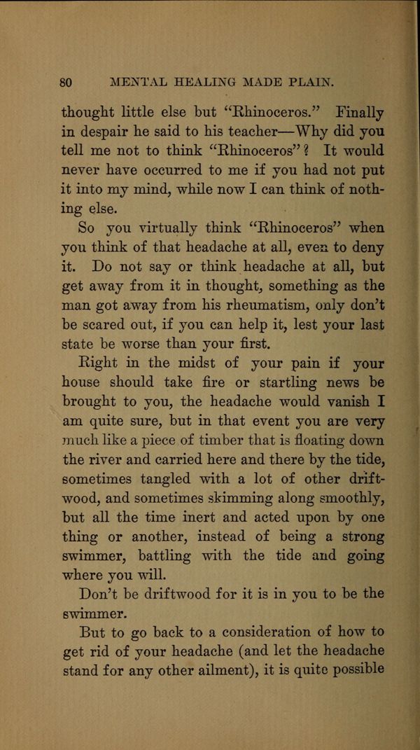 So you virtually think "Rhinoceros" when you think of that headache at all, ever to deny it. Do not say or think headache at all, but get away from it in thought, something as the man got away from his rheumatism, only don't be scared out, if you can help it, lest your last state be worse than your first.