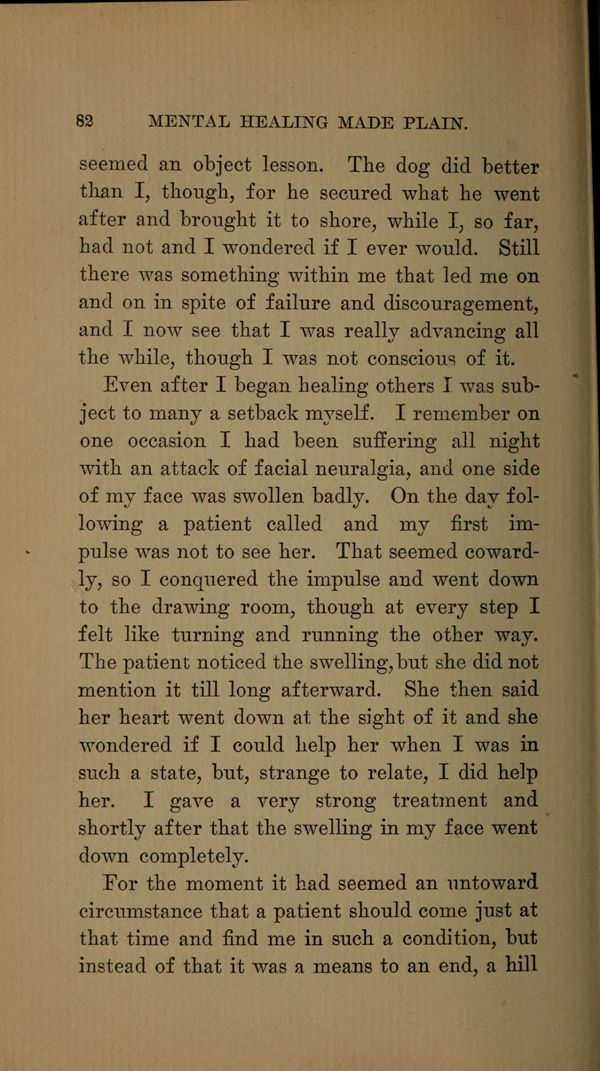 Even after I began healing others I was subject to many a setback myself. I remember on one occasion I had been suffering all night with an attack of facial neuralgia, and one side of my face was swollen badly. On the day following a patient called and my first impulse was not to see her. That seemed cowardly, so I conquered the impulse and went down to the drawing room, though at every step I felt like turning and running the other way.
