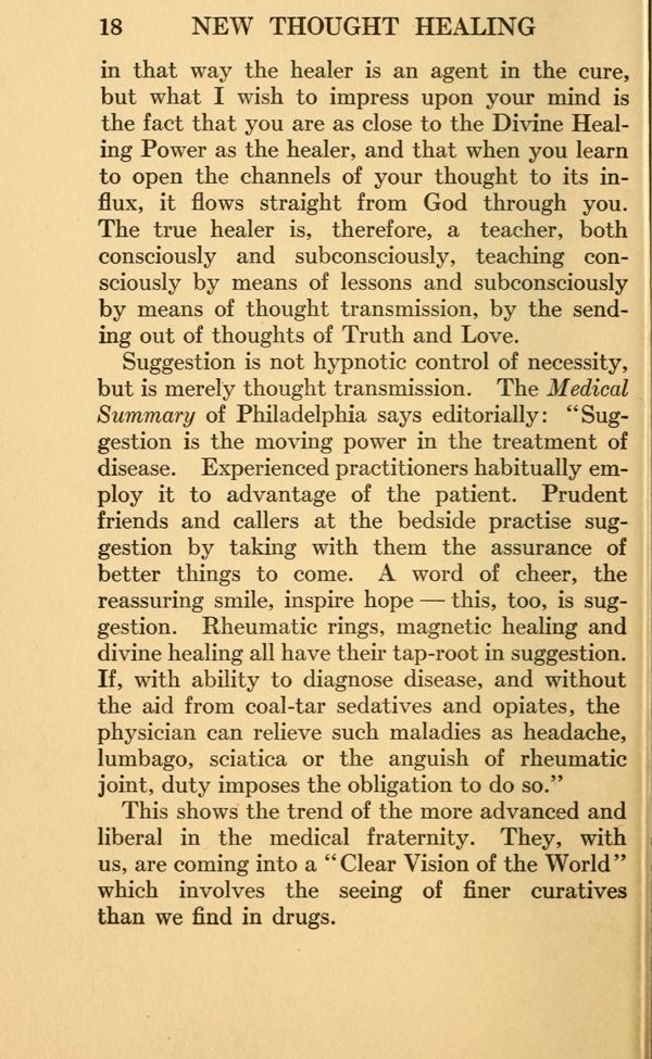 Suggestion is not hypnotic control of necessity, but is merely thought transmission. The Medical Summary of Philadelphia says editorially: "Suggestion is the moving power in the treatment of disease. Experienced practitioners habitually employ it to advantage of the patient. Prudent friends and callers at the bedside practice suggestion by taking with them the assurance of better things to come. A word of cheer, the reassuring smile, inspire hope — this, too, is suggestion. Rheumatic rings, magnetic healing and divine healing all have their tap-root in suggestion. If, with ability to diagnose disease, and without the aid from coal-tar sedatives and opiates, the physician can relieve such maladies as headache, lumbago, sciatica or the anguish of rheumatic joint, duty imposes the obligation to do so." This shows the trend of the more advanced and liberal in the medical fraternity. They, with us, are coming into a "Clear Vision of the World" which involves the seeing of finer curatives than we find in drugs.