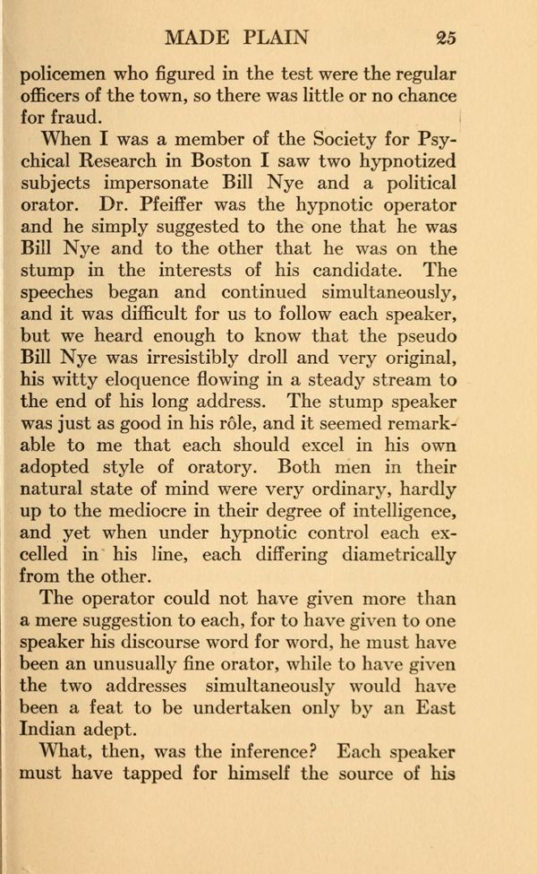 When I was a member of the Society for Psychical Research in Boston I saw two hypnotized subjects impersonate Bill Nye and a political orator. Dr. Pfeiffer was the hypnotic operator and he simply suggested to the one that he was Bill Nye and to the other that he was on the stump in the interests of his candidate. The speeches began and continued simultaneously, and it was difficult for us to follow each speaker, but we heard enough to know that the pseudo Bill Nye was irresistibly droll and very original, his witty eloquence flowing in a steady stream to the end of his long address. The stump speaker was just as good in his role, and it seemed remarkable to me that each should excel in his own adopted style of oratory. Both men in their natural state of mind were very ordinary, hardly up to the mediocre in their degree of intelligence, and yet when under hypnotic control each excelled in his line, each differing diametrically from the other.