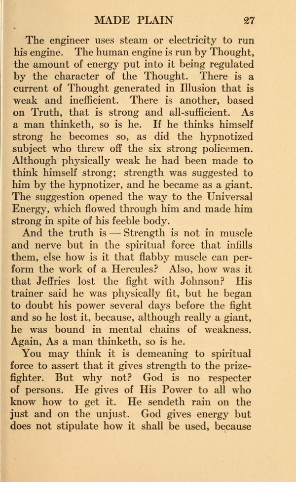 And the truth is — Strength is not in muscle and nerve but in the spiritual force that in fills them, else how is it that flabby muscle can perform the work of a Hercules? Also, how was it that Jeffries lost the fight with Johnson? His trainer said he was physically fit, but he began to doubt his power several days before the fight and so he lost it, because, although really a giant, he was bound in mental chains of weakness. Again, As a man thinketh, so is he.