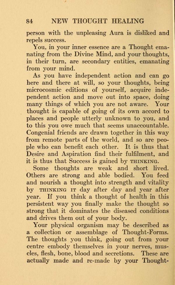 As you have independent action and can go here and there at will, so your thoughts, being microcosmic editions of yourself, acquire independent action and move out into space, doing many things of which you are not aware. Your thought is capable of going of its own accord to places and people utterly unknown to you, and to this you owe much that seems unaccountable. Congenial friends are drawn together in this way from remote parts of the world, and so are people who can benefit each other. It is thus that Desire and Aspiration find their fulfilment, and it is thus that Success is gained by THINKING. Some thoughts are weak and short lived.