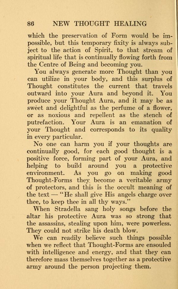 No one can harm you if your thoughts are continually good, for each good thought is a positive force, forming part of your Aura, and helping to build around you a protective environment. As you go on making good Thought-Forms they become a veritable army of protectors, and this is the occult meaning of the text — "He shall give His angels charge over thee, to keep thee in all thy ways."