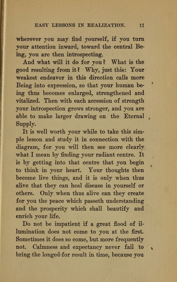 And what will it do for you? What is the good resulting from it? Why, just this: Your weakest endeavor in this direction calls more Being into expression, so that your human being thus becomes enlarged, strengthened and vitalized. Then with each accession of strength your introspection grows stronger, and you are able to make larger drawing on the Eternal Supply.