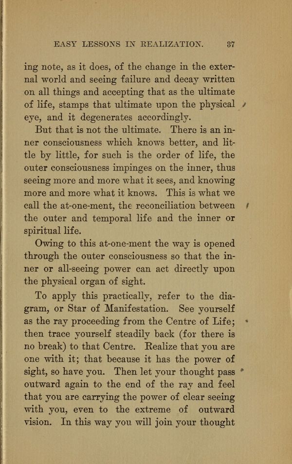 Owing to this at-one-ment the way is opened through the outer consciousness so that the inner or all-seeing power can act directly upon the physical organ of sight.