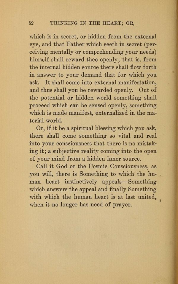 Call it God or the Cosmic Consciousness, as you will, there is Something to which the human heart instinctively appeals Something which answers the appeal and finally Something with which the human heart is at last united, when it no longer has need of prayer.